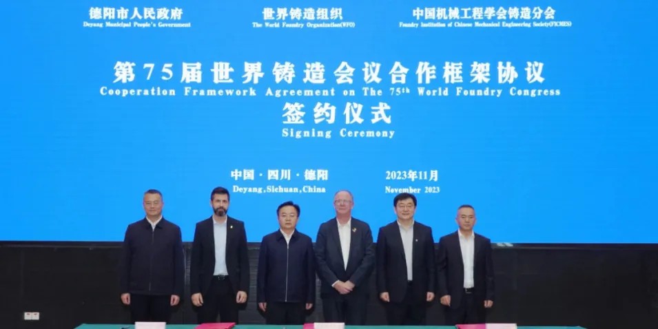 2023年11月10日,德阳市人民政府、世界铸造组织、中国机械工程学会铸造分会在德阳签署《第75届世界铸造会议合作框架协议》